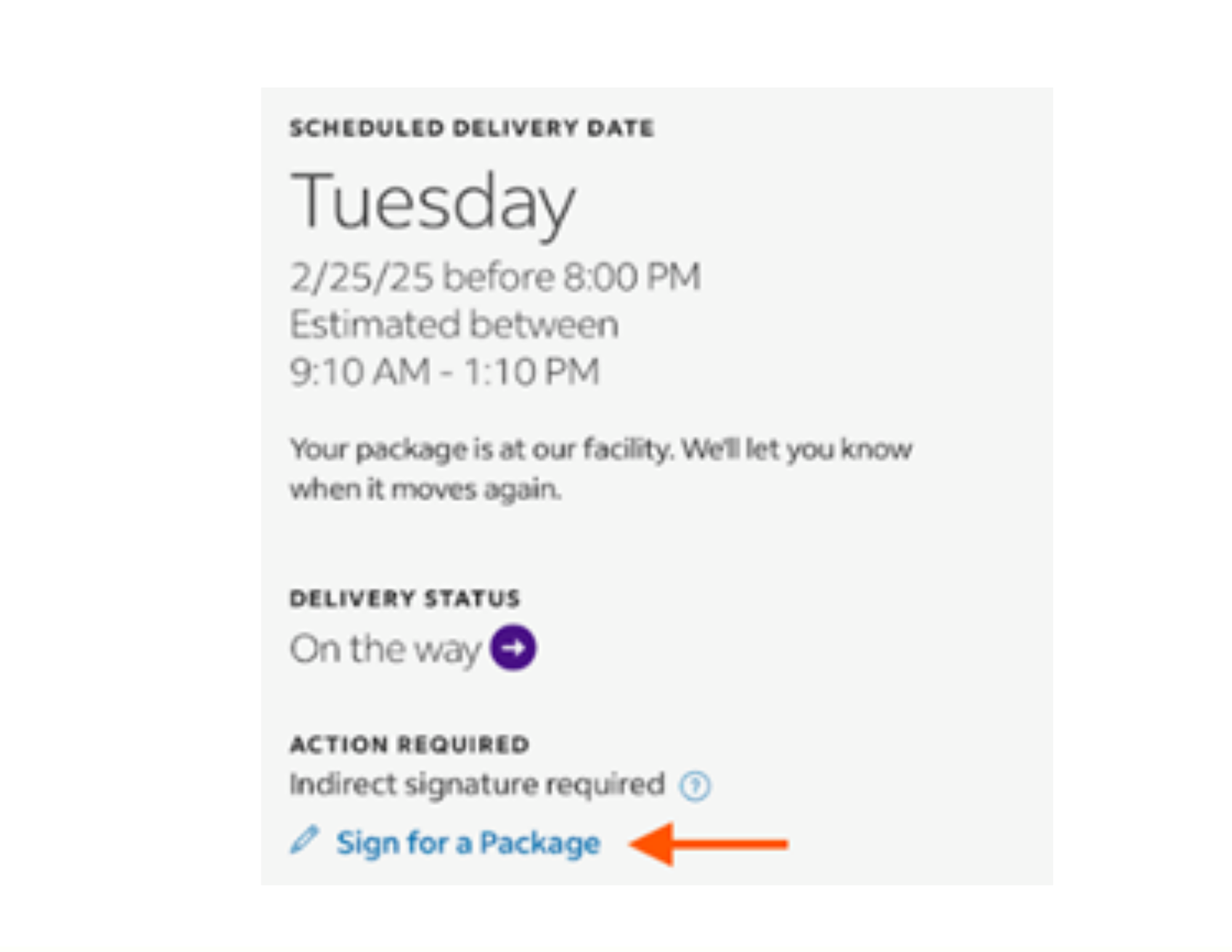 Click the link in the text message to go to the FedEx website. Here, you can view your estimated delivery date and select the option to sign for your package.