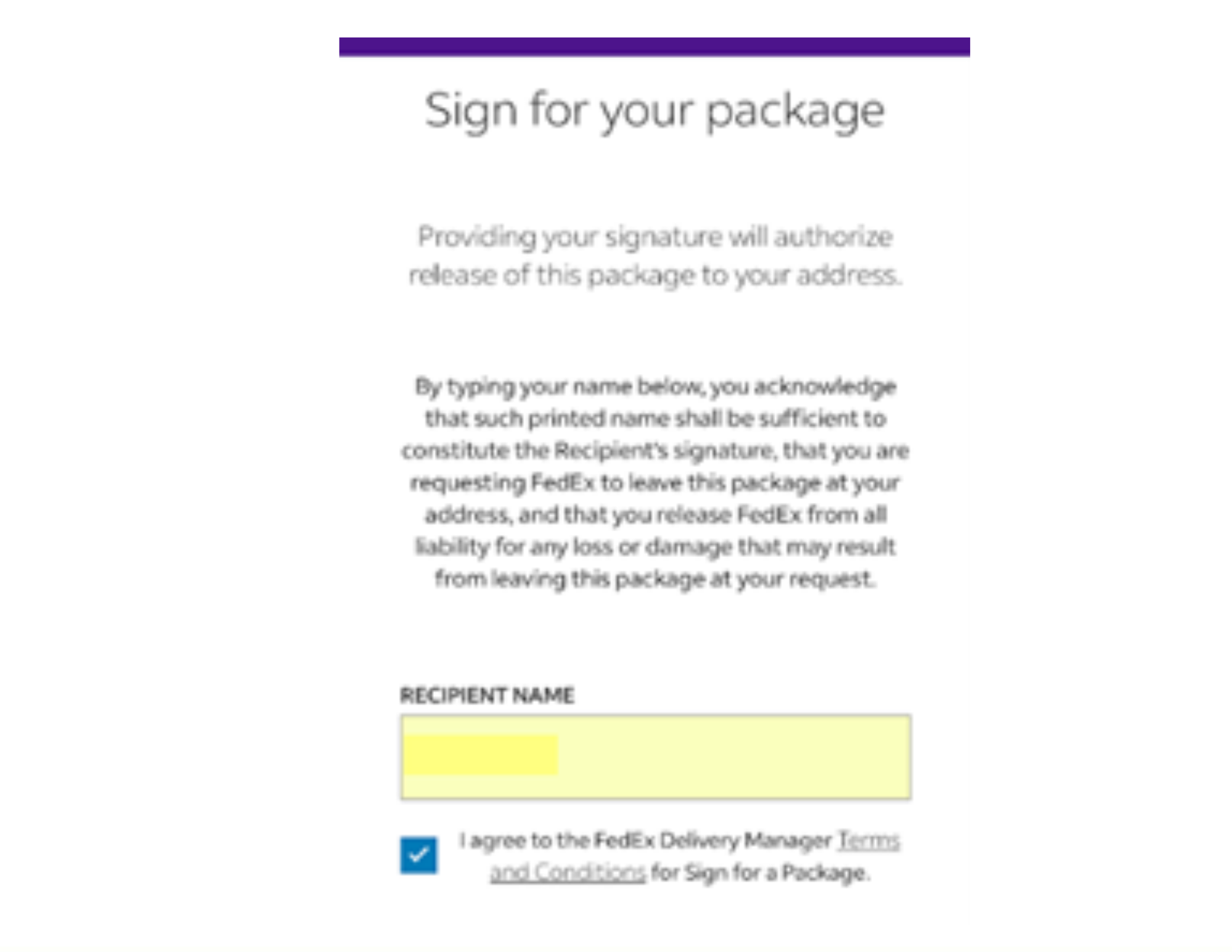 Once your identity is verified, you will be prompted to enter your name to sign for the package.
